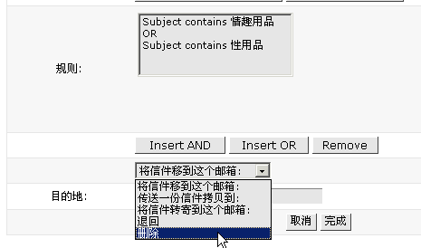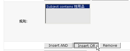 5> 由于还要同时拒绝含有"情趣用品"标题的邮件,因此点击"insert Or" 这是"或者"的意思,"Insert And"是"并且"的意思