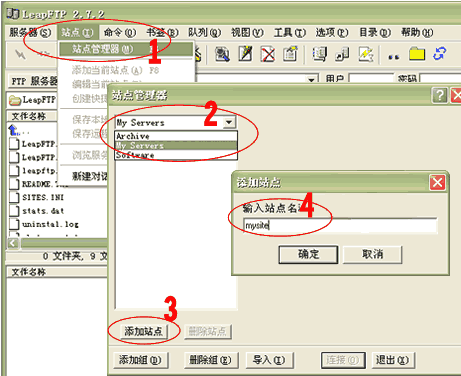 2. 运行 LeapFTP,点击1处(站点->站点管理器),弹出“站点管理器”窗口;在2处选择“My Servers”项,然后在3处点击“添加站点”按钮,在弹出的窗口4处输入您喜欢的站点名称(如:mysite);