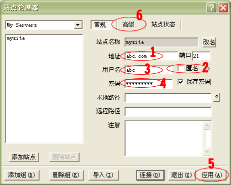 3.点击“确定”后,出现以下界面。在1处输入您的站点地址(如:abc.com),将2处“匿名”前的选钩去掉,在3处输入FTP用户名(如:abc),在4处输入FTP密码(将保存密码前的选钩打上),点击5处“应用”按钮;