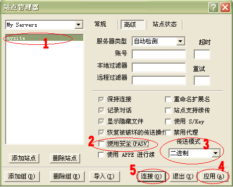 4.点击上图 6 处, 切换到“高级”标签(如下图)。 在1处选中刚建立的站点名称(mysite),将2处的选钩去掉,在3处的“传送模式”选择二进制,点击4处“应用”。