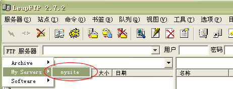 5.您可以点击上图5处“连接”按钮,直接进入连接状态;也可以回到主菜单点击 “FTP 服务器”-> “My Servers” -> “mysite” 进入连接状态。