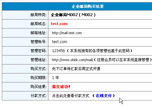 此时您将看到订单提交的结果,如果您的帐户上有足够款项,并且您选择的注册方式是"正式购买",那么邮局将马上开通成功并扣除购买款项,如果您选择的开通方式是"只交订单",那么空间并没有真正开通,只是提交到了我们的申请订单里,这时,您需要按"汇款方式"办理汇款,并通知我们,我们将马上为您办理后续事宜。完全不用您自己操心。